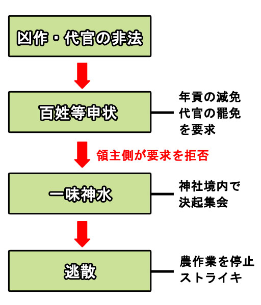 一揆を起こすには理由と要求があります。凶作のために年貢・雑公事(今で言うところの税金)の減免や暴利を課している地頭の解職などを領主に要求しました。