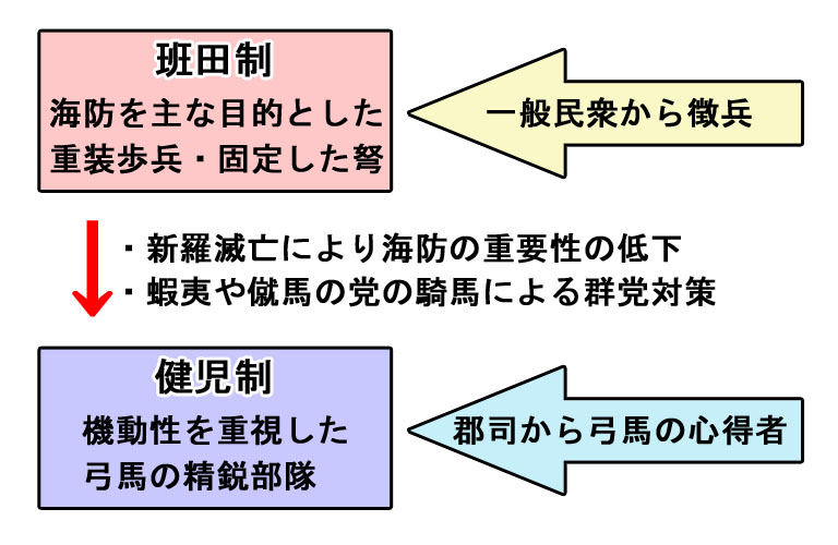 9世紀に入って弩・歩兵中心から弓・騎兵中心の兵科に軍事改革がありました。理由としては敵対国である新羅が滅亡して海防の重要性が低くなったこと、東北地方の『蝦夷(俘囚)』の反乱や東国で群党蜂起した『僦馬の党』の対応で機動性のある軍隊が必要になったためでした。